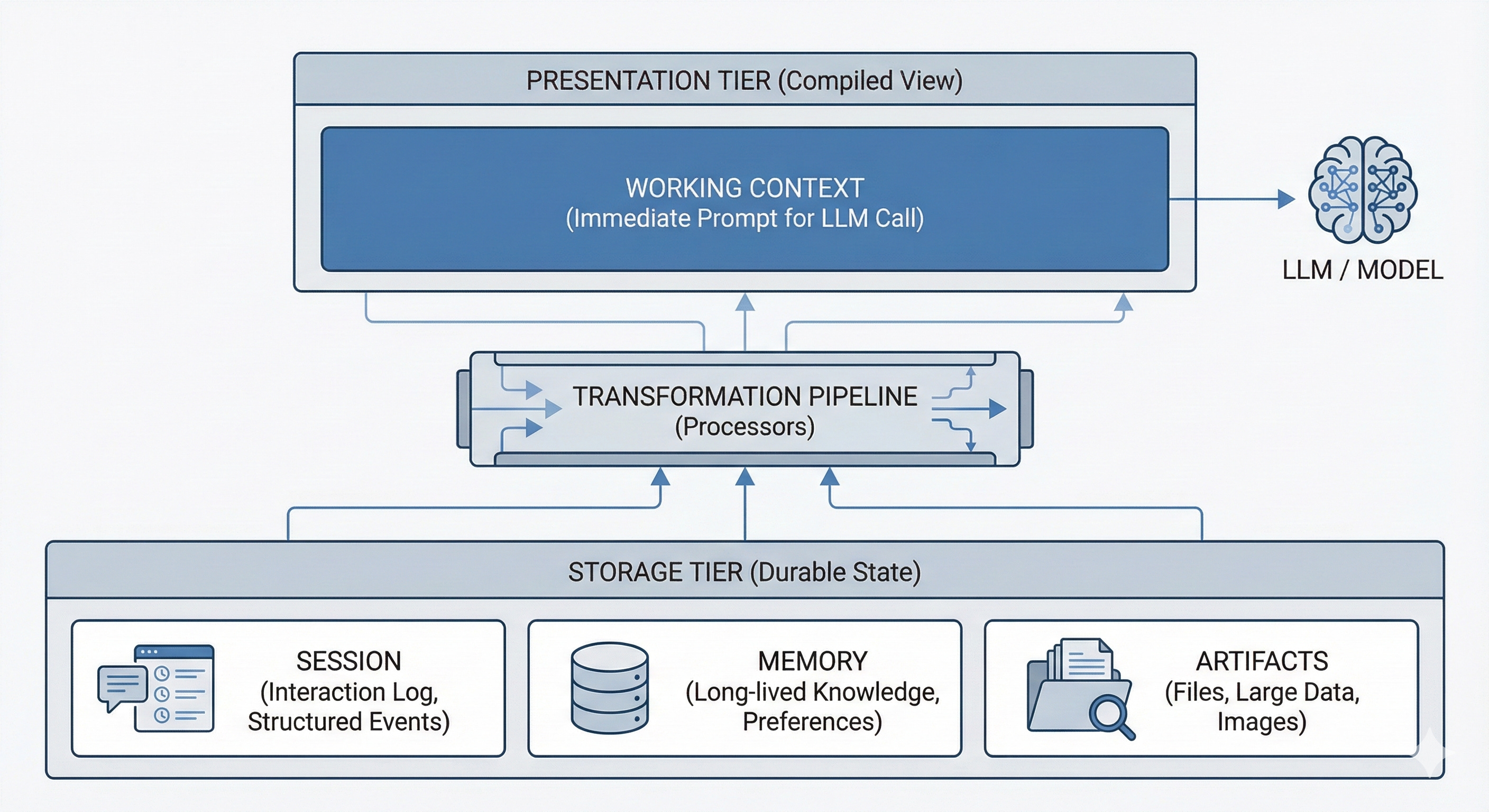 This recent Google blog post describes a more sophisticated method for context engineering, implemented in Google’s Agent Development Kit. This approach, shown in the figure below, distinguishes three different kinds of information resources that the AI agent may need to access.